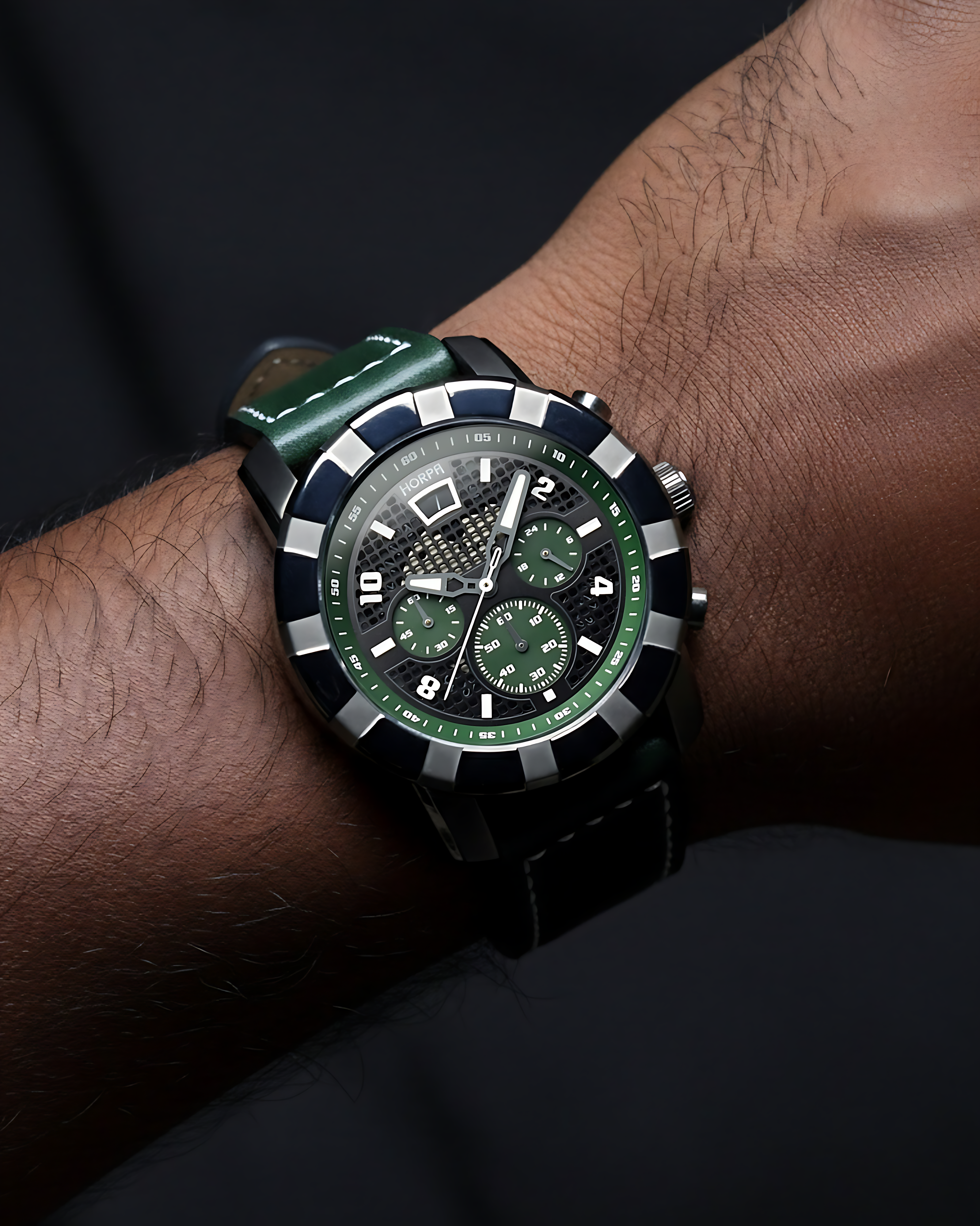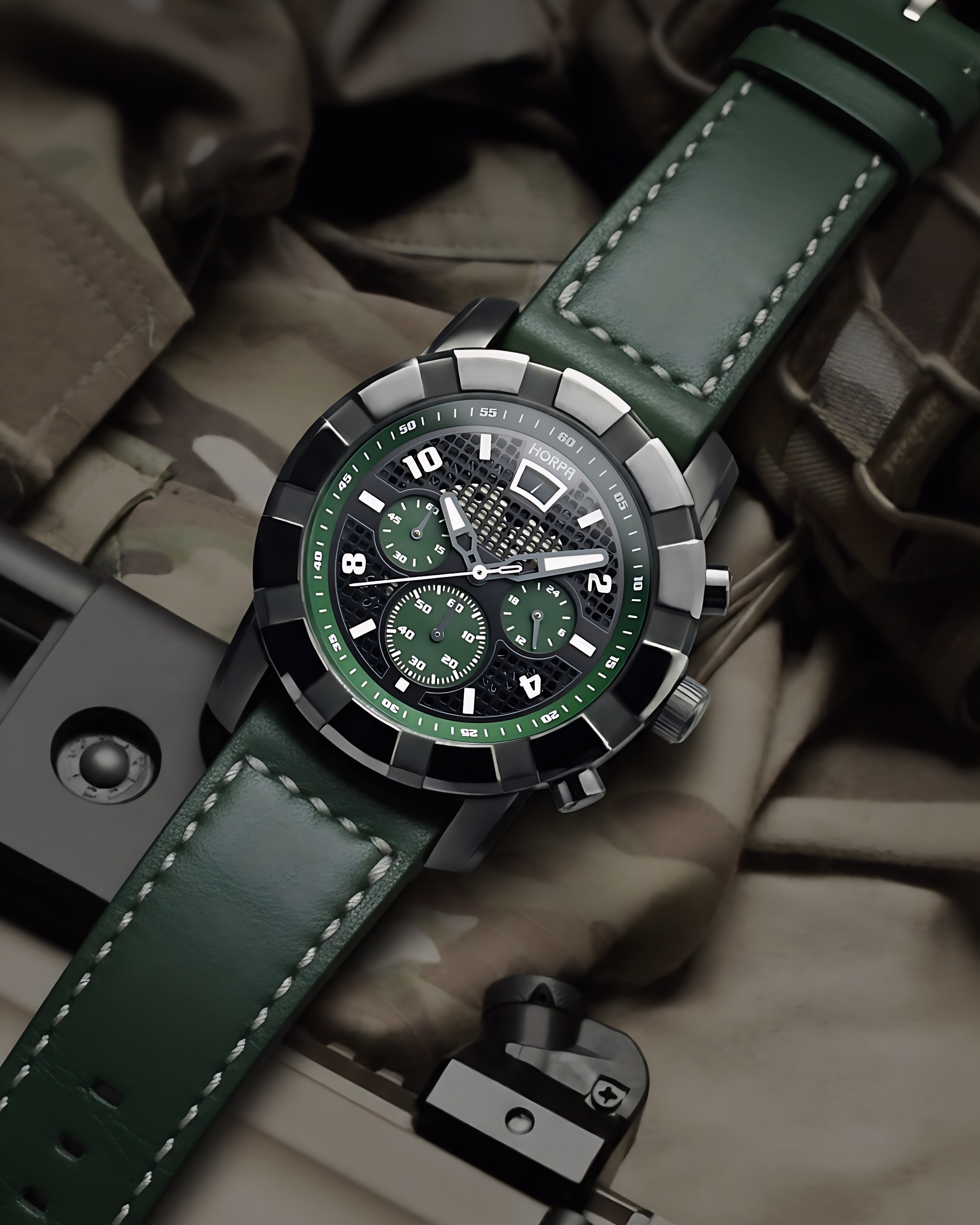 With its rugged IP gunmetal case and the distinct, grounding blend of a soldier green and anthracite grey dial, this watch feels instantly familiar, like a trusted companion. The hand-crafted green leather strap adds to that authentic connection, making it truly feel like part of your everyday arsenal.